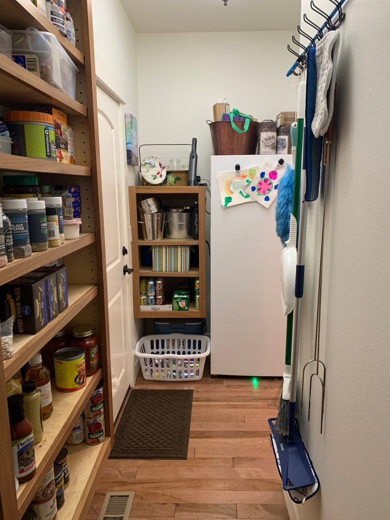 You don’t have to have a huge or customized pantry to use these ideas. I have applied the same concepts of organizing my work spaces for the best efficiency possible when we had 4 kids in a 2 bedroom condominium with a tiny kitchen, 5 kids in a 3,000 square foot home with a huge kitchen, and even when all 7 of us were living in our 31 foot motor home for the first several months after we relocated from the big house in California to Oregon!