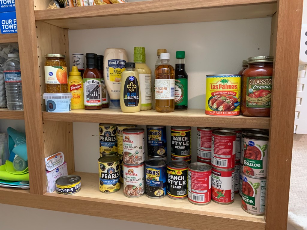 This eliminates things getting lost at the back of the shelving because you can’t see what’s there. My “can” shelf is deep enough for 2 1/2 cans and allows for 2 normal size cans to be stacked 2 high and 2 deep. So I can essentially unload a box of diced tomatoes from Costco in two rows. It also allows for larger cans, jars, or boxes to fit where I can see what I have (or what I’m running out of) and I’m not having to move items around to see what is hiding at the back.