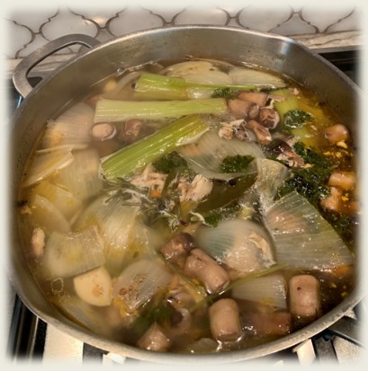 The thing that makes this so easy, is the little baggies of chicken stock ingredients I keep in my freezer. For instance, I usually have a few celery ends left that are starting to age that I stow in a snack baggy instead of tossing them. And I always have a small baggy ready when I’m making roasted vegetables for the mushroom stems. Basically, any washed vegetable or fresh herb that might get tossed in a couple of days can be bagged up and preserved in the freezer! When I debone a whole chicken, I save the wings and bones in a baggy, but I think my favorite base for bone broth is from the bones pulled from seasoned, baked chicken thighs.