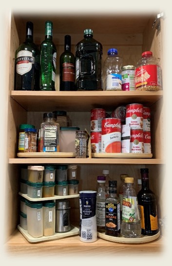 Standard wall cabinets are 11-12″ deep inside (make sure to take structural ledgers into account in your depth measurements!), and can be maximized by turntables that enable you to easily see all of the items stored on each shelf. Make sure to group items together according to what you use the most in each area of your space.