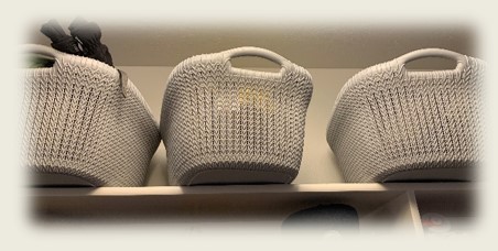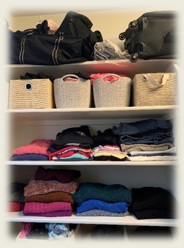 Open shelving in the kitchen is great for things like cookbooks or display items, but it is really better utilized in closets or utility areas. Here, you want to store items that you need to easily see what variety you have for the need at hand. In the picture of part of my closet, above, you can see that I have things like sweaters, shirts, shorts, and sweats easy to identify in stacks that utilize the entire depth of the shelf, while smaller items like undergarments and swimsuits are in bins that can be pulled from the shelves when I need to select one from a bunch. Cute bins are another way to create handy drawers for things you don’t want to display.