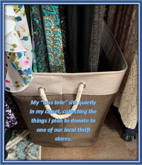 - If you itemize your tax deductions, this is an easy way to track your donations: A few times a year, I pull out my toss tote, and group things together so I can see everything laid out in sections. I take pictures of each section of goods such as women’s clothing, kitchen wares, men’s clothing, etc. before loading it all up to donate. (This is the point in which a few – very few – items have made their way back to the closet or cupboard!) So I have pictures of everything I have donated, ready to be assembled in a document where I can easily list and price the items to attach to the donation receipt for tax return preparation!