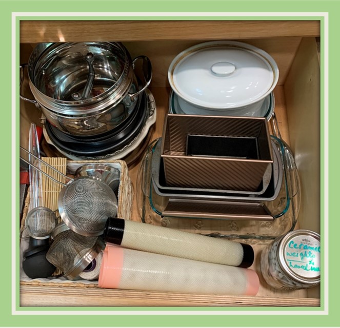 Since I have started baking several days a week, I decided to reorganize a few areas yesterday. Even though I regularly assess what I use/need versus what I can get rid of, I was surprised to find several items in my kitchen that I have held on to for no good reason. I’ve been using the “toss basket” technique for many years, and it has proven to be a really good way to minimize the pressure of separating from my stuff before I’m ready to do so. So, I carried the items to the receptacle in the closet to quietly wait for another day, and received the benefit of having an uncluttered space for my new baking gear.