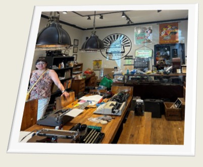 Well, upon arriving that Sunday afternoon, I knew our trip would not be in vain. We waited a few minutes for the storekeeper to return from an errand, and when Tony opened the door to TYPE SPACE, we entered a modern shop with the old world vibe I was looking for. One of the first things I noticed amid the selection of machines was a picture on the wall of Tom Hanks standing in the store with Tony, which felt to me so appropriate, since we made this journey based on that indelible yearning for a typewriter of my own based on the reading of his book. I only tried a couple of the manual typewriters on display, because I wasn’t sure how much I would really use it, and my birthday budget was about $200. We happily headed home, after a delightful visit with Tony, with my new 1961 Olympia SM-7.