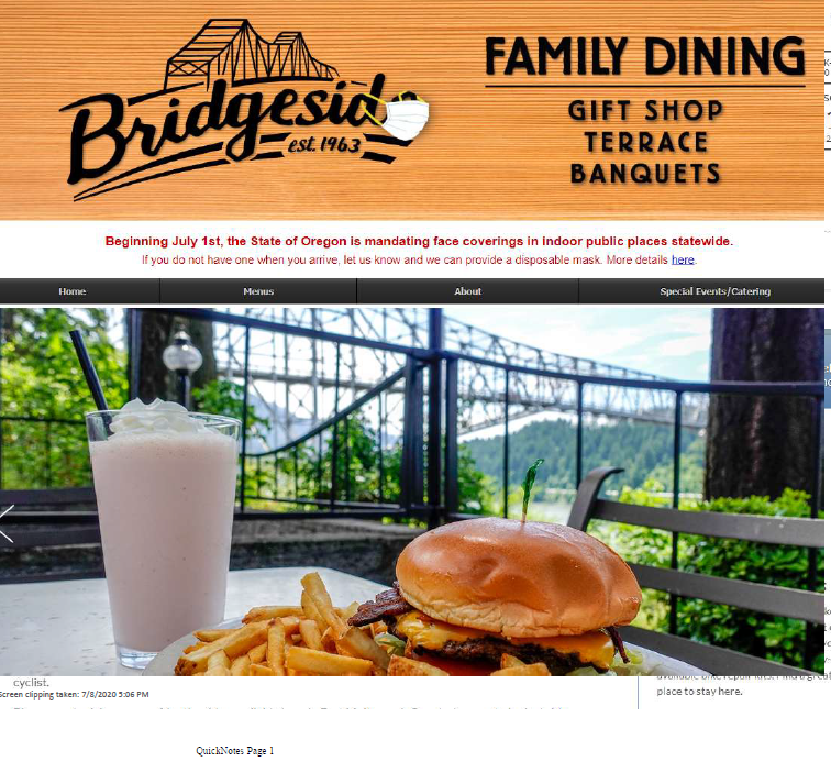 The notice in red font informed, “Beginning July 1st, the State of Oregon is mandating face coverings in Indoor public places statewide.” I was not a fan of wearing a mask, so any opportunity to sit outside for a meal was a big plus for me!