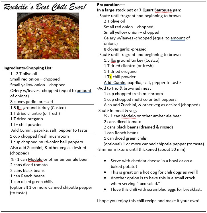 My BEST CHILI EVER!! I created this recipe when I was doing Noom for weight loss. I learned about the fact that foods with higher water content make us feel full with fewer calories, and was inspired to create a tasty chili that would be satisfying with fewer calories. The basic concept is to have approximate equal portions of each of the veggies and more veggies than meat when it is combined.